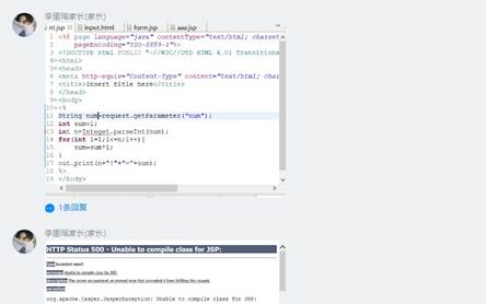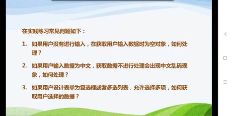带着提出的三个问题,开始本节课的学习,通过完成三个教学小任务进行课程知识点剖析讲解。首先对比null对象与空串的区别,给出null对象抛出异常时的解决方案;然后讲解进行中文信息处理的两种方法并给出其应用场景及区别;最后通过实例演示讲解获取复选数据的方法getParameterValues()的功能和使用。并对案例完成进行了知识点总结。整个教学过程环环相扣,连成一体,课堂上学生互动积极性比较高,师生之间通过钉钉进行交流,有效活跃了课堂气氛。