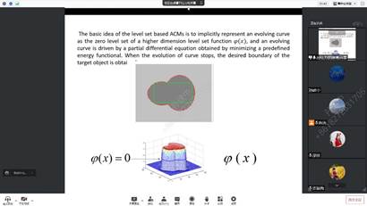 吕红力博士做了题为《Active contour model based on local absolute difference energy and fractional-order penalty term》的专题报告,首先讲解了图像分割的变分水平集方法;其次,介绍了基于局部平均绝对差的灰度分布非均匀图像校正方法、噪声鲁棒性局部绝对差能量泛函的构建和分数阶正则化泛函的设计;最后,展示了该模型在分割受到灰度分布不均匀以及噪声污染图像时的准确性。