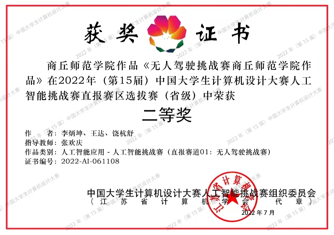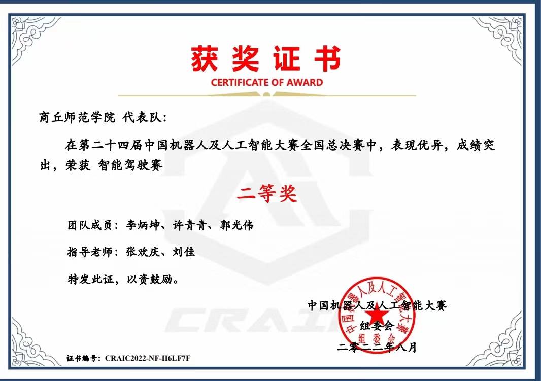 2022年8月,由中国人工智能学会举办的第二十四届中国机器人及人工智能大赛落下帷幕,kaiyun登录中国入口登录许青青等三名学生通过层层选拔,在此次角逐中荣获智能驾驶赛国赛二等奖。