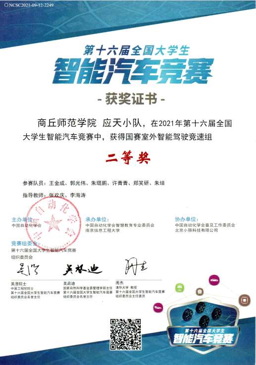 由中国自动化学会主办的第十六届全国大学生智能汽车竞赛以线上形式举办。kaiyun官网kaiyun登录中国入口登录教师张欢庆、李海涛担任指导老师,与六名学生共同组成“应天小队”积极报名参加并荣获第十六届全国大学生智能汽车竞赛国赛二等奖。