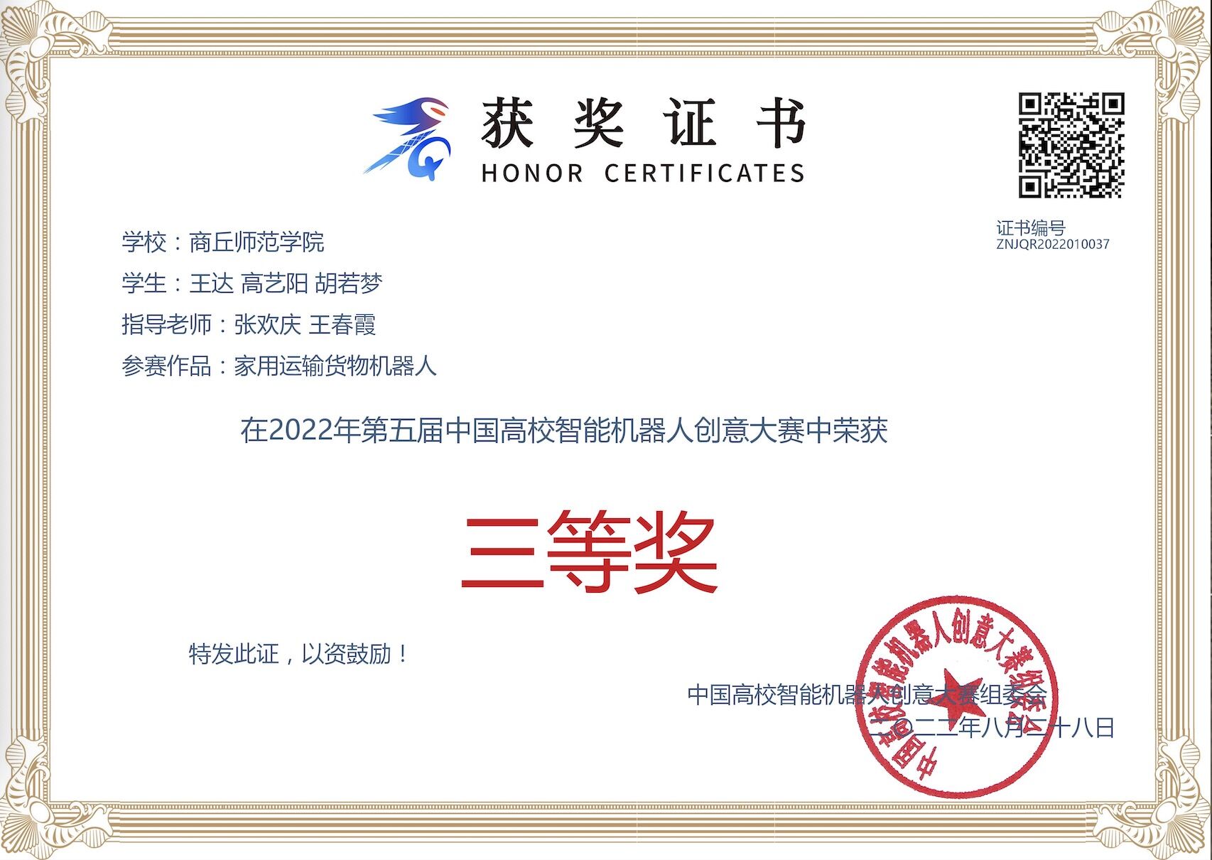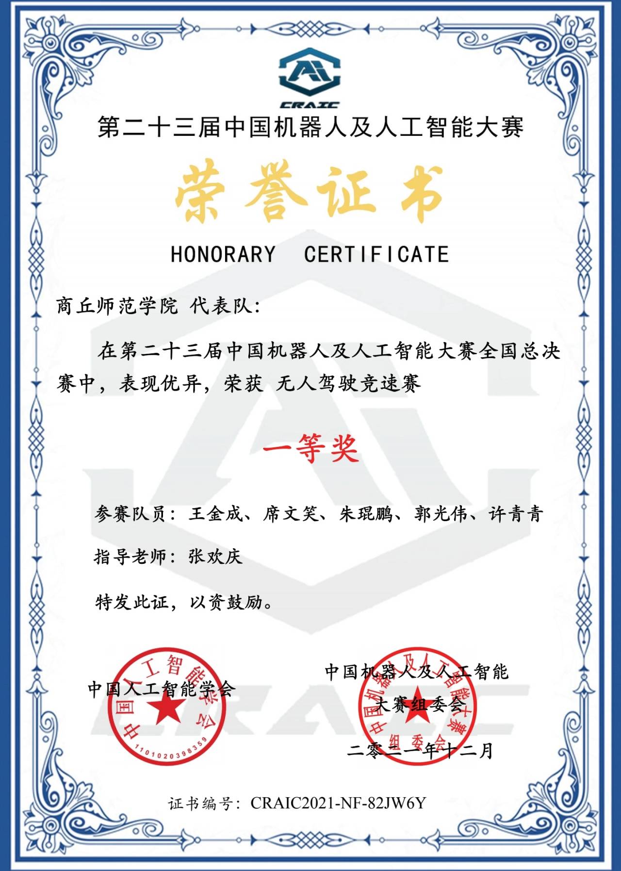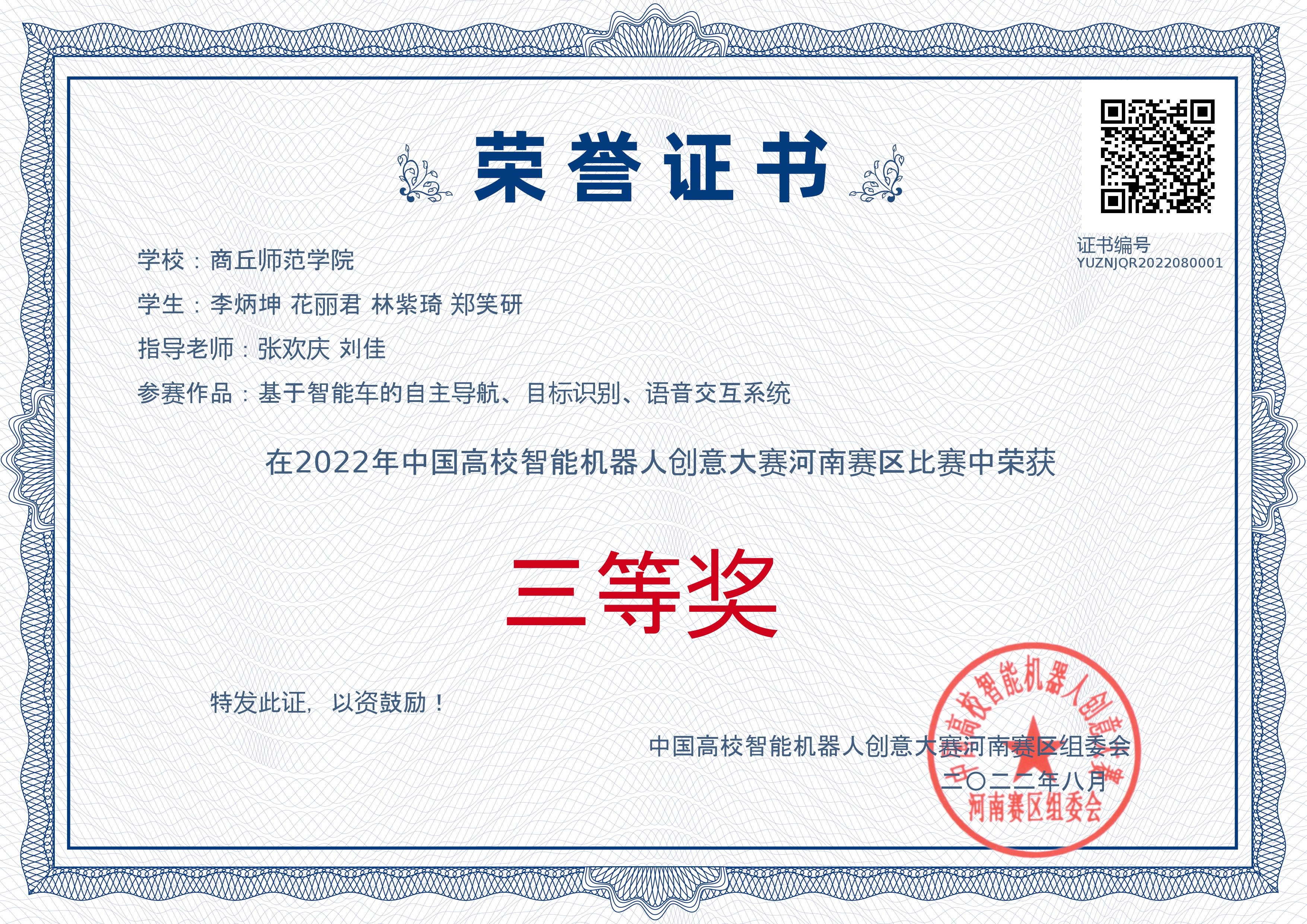 中国机器人及人工智能大赛作为中国人工智能学会最早主办的竞赛之一,该赛事是目前国内规模最大、影响力最强、专业水平最高的机器人大赛,属于国家级 A 类赛事,大赛已为我国培养了大量“能动手”、“敢创新”、“可协同”的复合型人才。指导老师张欢庆带领学生在创新类、应用类、竞技类的不同赛事下,开展人工智能算法研究。