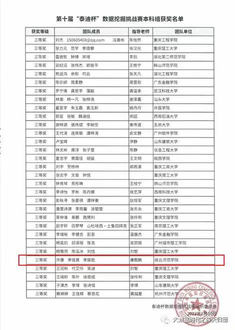 2022年6月,第十届“泰迪杯”数据挖掘挑战赛落下帷幕,获奖名单相继公示。kaiyun登录中国入口登录大数据专业共派出3支学生队伍参赛,最终荣获本科组全国二等奖1个,全国三等奖1个,省级一等奖1个,省级二等奖1个。