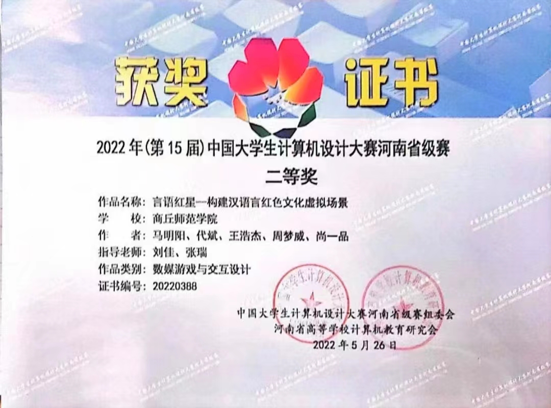由全国高等学校计算机教育研究会主办,各高校计算机相关院系承办的第十五届中国大学生计算机设计大赛中,kaiyun官网学子李炳坤等三名学生荣获人工智能挑战赛类别省赛二等奖; 马明阳等五名学生组成的团队荣获数媒游戏于交互设计类别省赛二等奖。