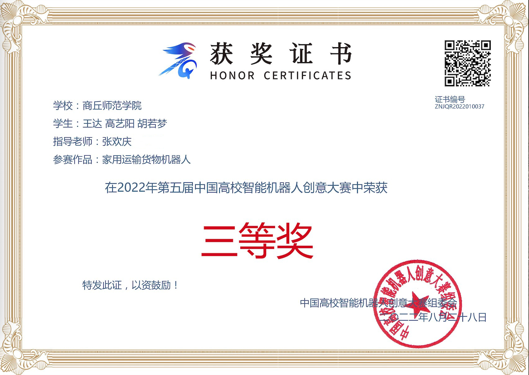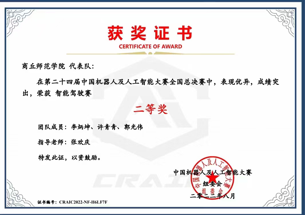 在第二十四届中国机器人及人工智能大赛智能驾驶赛的103支国赛队伍中,以全国第31名、河南省第3名的成绩获得全国总决赛二等奖1项,此前河南省赛时获得省级二等奖1项;在第五届中国高校智能机器人创意大赛中获得全国总决赛三等奖1项、省赛一等奖和三等奖各1项;在第十五届中国大学生计算机设计大赛中获得区域赛二等奖1项,已成功晋级全国总决赛。