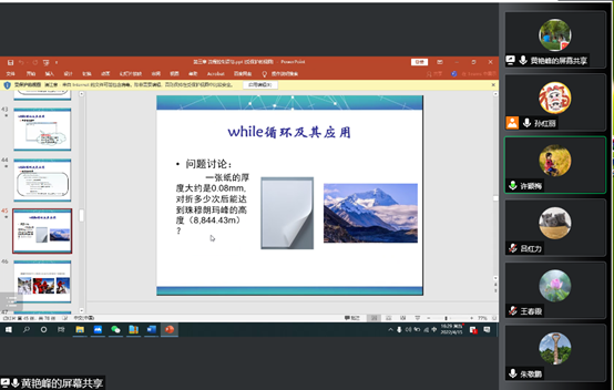 黄艳峰老师分享了一个自己教学过程中的思政融入案例,在讲授Java语言循环结构时,通过一个例子(一张纸折叠多少次能达到珠峰高度)引入教学内容,讲授知识点同时,讲解中国登山队攀登珠峰,来引导学生不断突破自己,不断成长来提升自身能力,祖国强大离不开我们每个人的添砖加瓦。