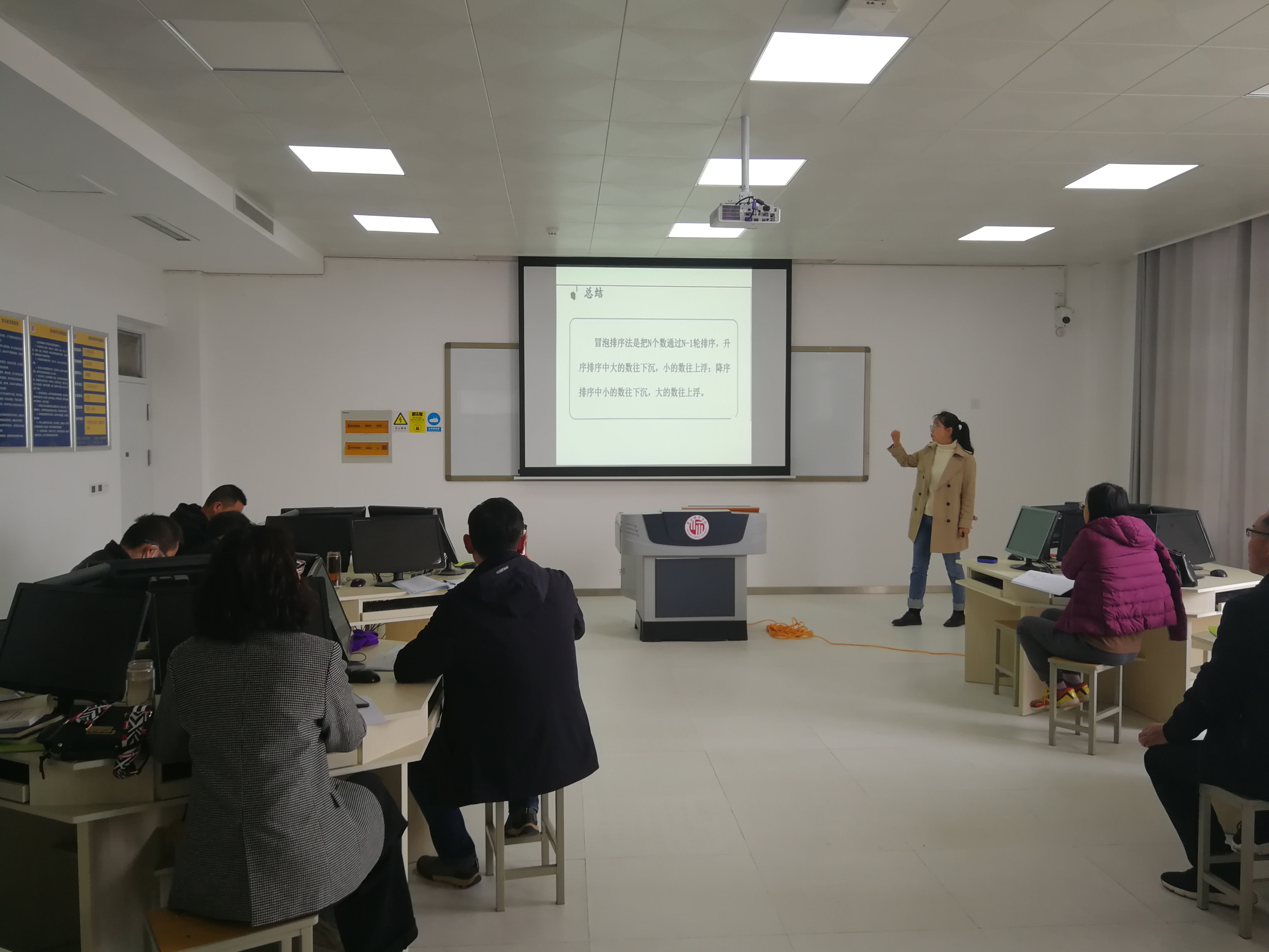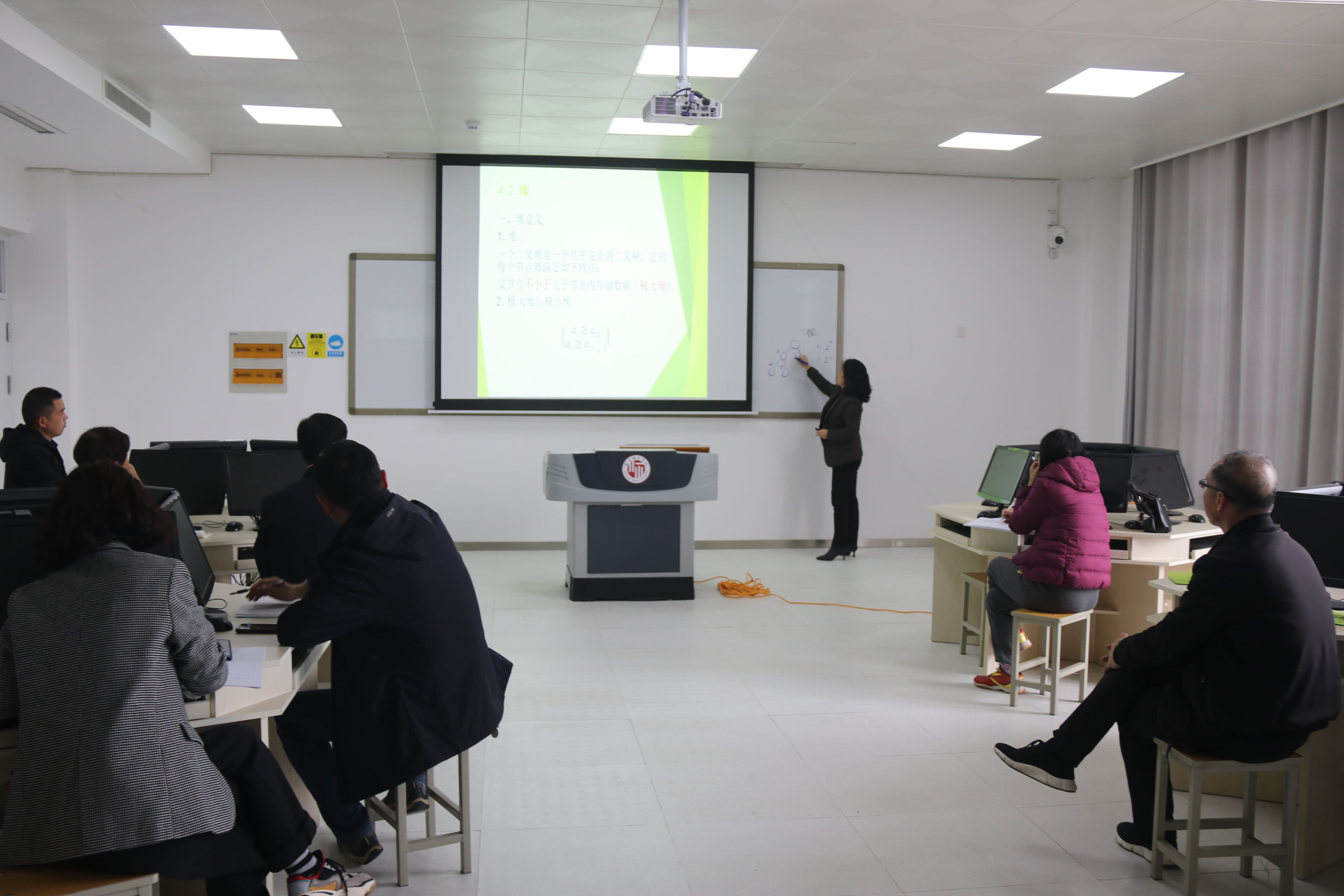 本次活动王帅芳博士讲授了Python程序设计中的冒泡法排序,她的教学设计富有趣味性,以一个日常生活中热带鱼吐泡泡引入冒泡法排序,讲述了冒泡排序基本思想,并以一个动画展示了排序过程;最后用Python语言实现排序算法并引导学生思考排序特点与时间复杂度;路红博士讲授了算法设计与分析中的第四章中堆分类;首先介绍了什么是堆并以极大堆为例讲述了堆的基本操作与辅助操作;最后实例展示了堆的创建过程;张春贞老师讲授了国际金融与国际贸易中的关税经济效益分析,她以贸易小国模型和贸易大国模型讲授了对比需求曲线和供给曲线分析,重点阐述了关税前与关税后消费、生产与进口得出结论差异;并对授课内容进行总结,引导学生深思本次课讲授知识模块。