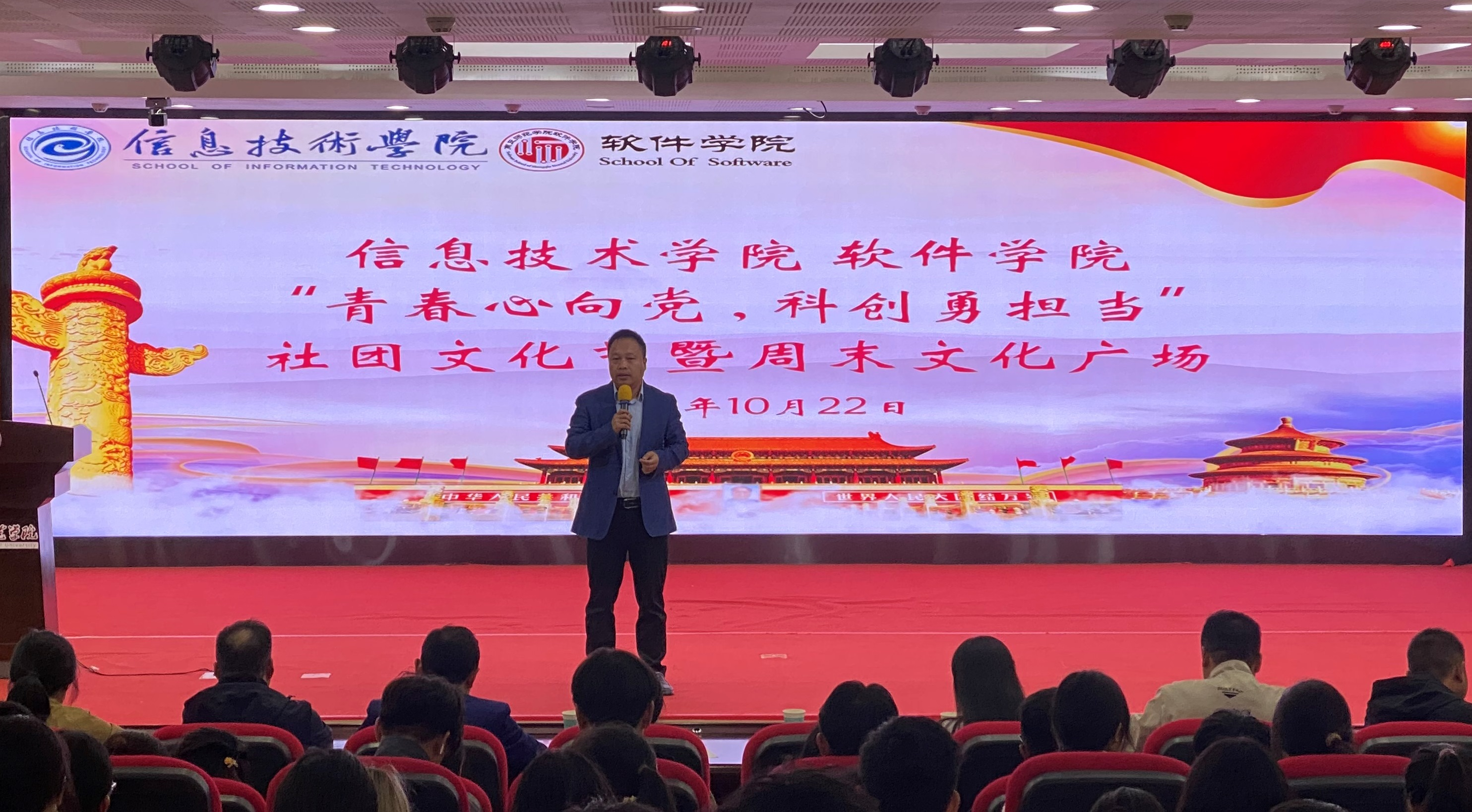 为进一步涵育优良学风,营造积极向上的学习氛围。10月22日晚,kaiyun登录中国入口登录在梁园校区三商楼举办了以“青春心向党,科创勇担当”为主题的社团文化节暨周末文化广场活动。信息技术学院党委书记王国华、院长王春霞、副书记袁慧、副院长刘佳、各社团指导老师和两百余名学生代表参加了活动。本次社团文化节共分为两个环节,分别在145主会场和八个分会场进行。