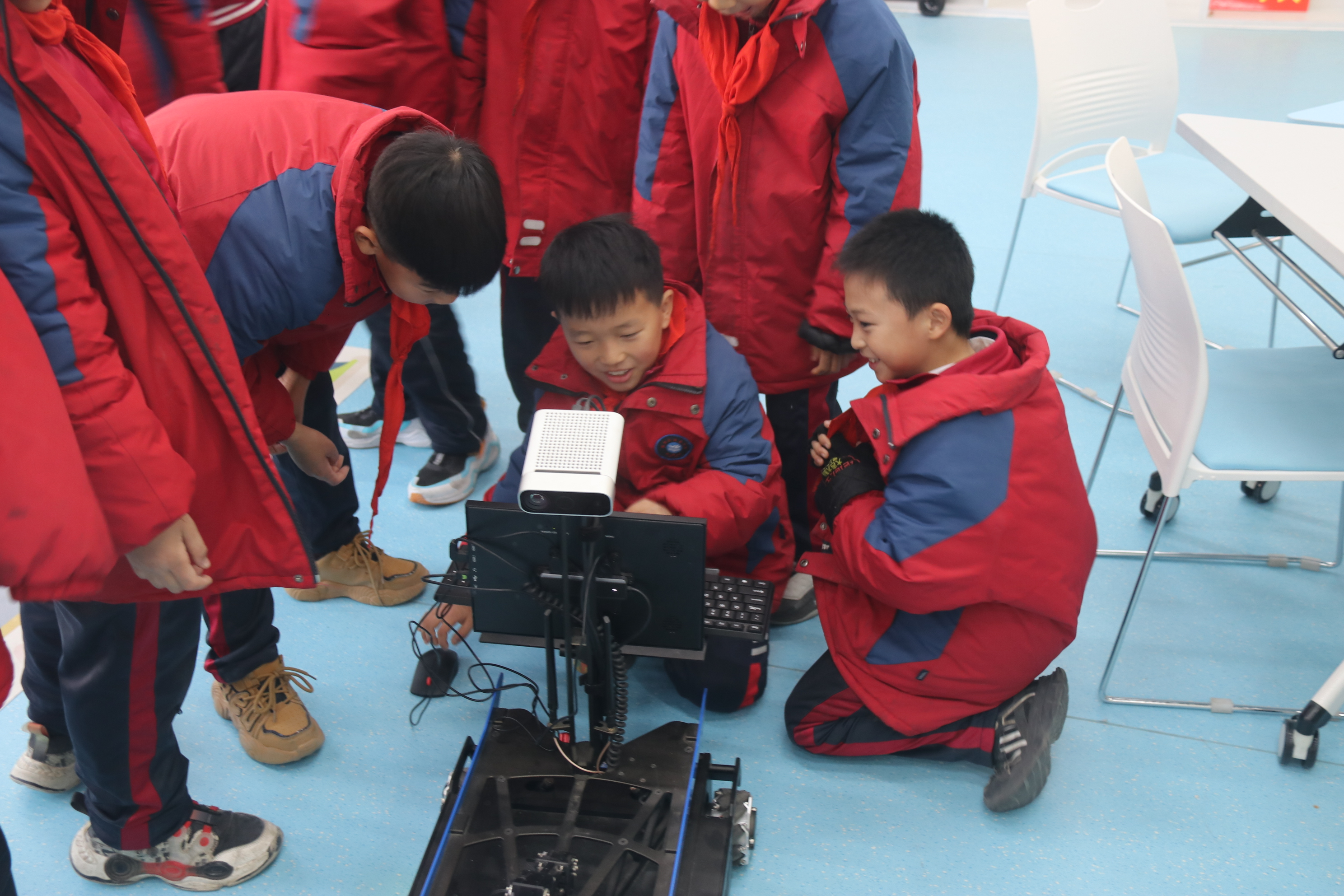 揭牌仪式后,该校学生在学院志愿者带领下开展科技社团研学活动,分别参观了人工智能教学实训中心、无人机应用中心、虚拟现实实训室等实验室,每个实验室都为参观人员安排了大学生志愿者进行知识讲解。小朋友们在参观过程中积极主动体验人工智能、VR等信息技术,现场氛围轻松有趣。