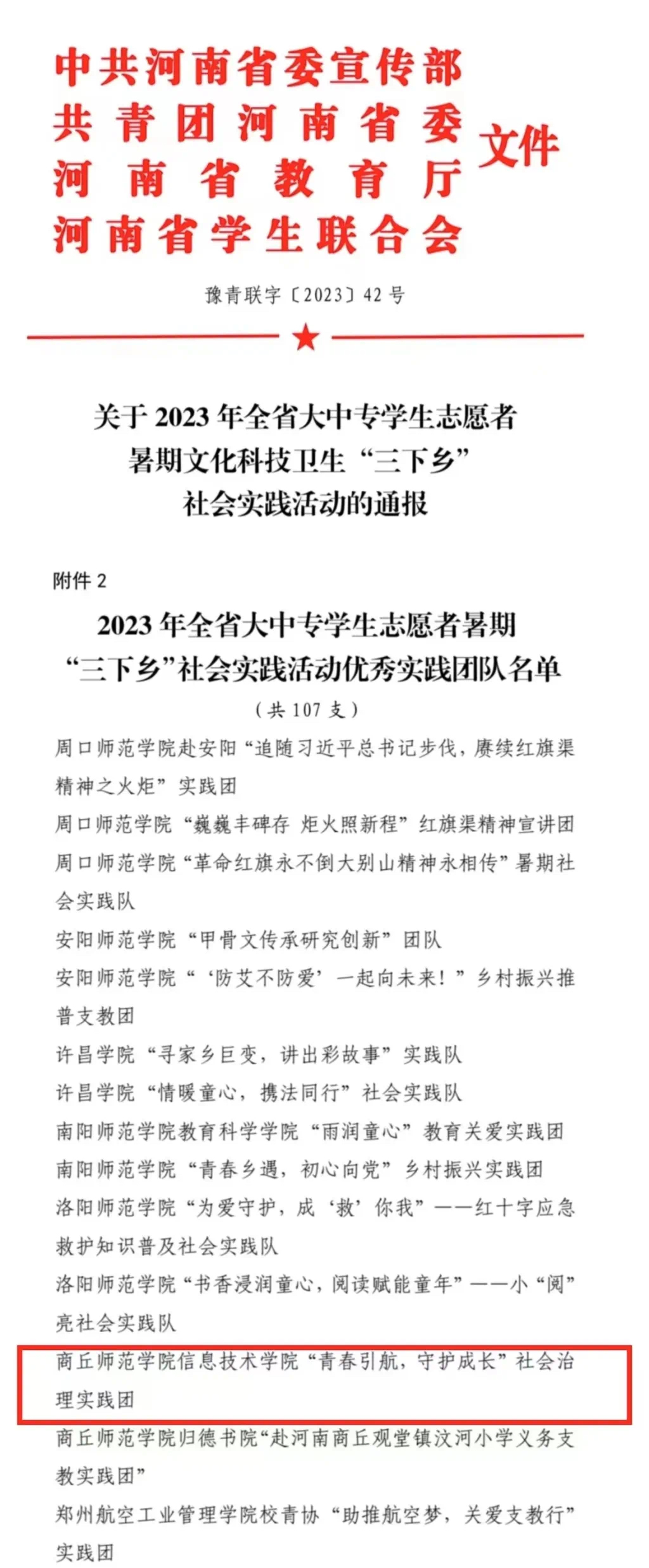 近日,团省委下发了《关于2023年全省大中专学生志愿者暑期文化科技卫生“三下乡”社会实践活动的通报》,表彰了积极组织、指导和参与社会实践活动并取得优秀成果的有关团组织、实践团队、品牌项目及个人,kaiyun官网“青春引航,守护成长”社会治理实践团获评优秀团队。