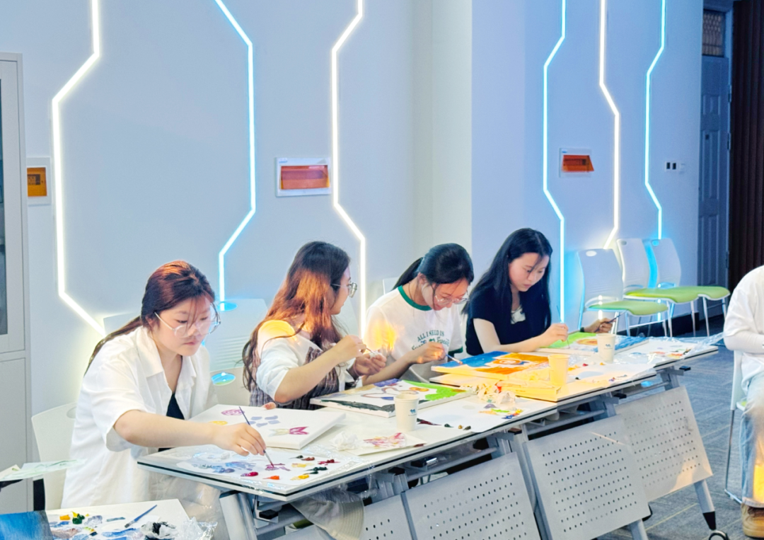随后,现场为学生提供油画创作工具,在轻柔的背景音乐中,学生们专注于画布,将抽象情绪转化为具象的视觉符号,用浓墨重彩堆叠内心的复杂思绪,以简洁线条勾勒平静的精神角落。