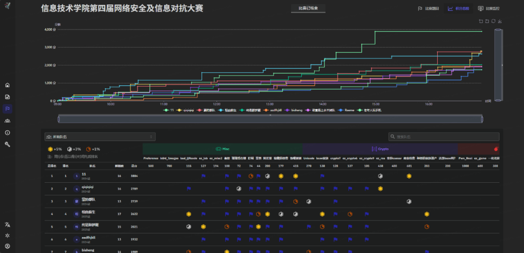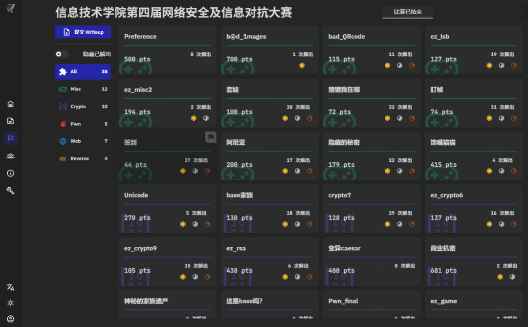 本届网络安全及信息对抗大赛采用 CTF 赛制,要求选手以个人形式参赛。赛事创新设置一血、二血、三血解题机制,题目采用动静态附件结合模式,涵盖 Crypto(密码学)、Misc(杂项)、Web(网络安全)、Reverse(逆向工程)、Pwn(二进制漏洞利用)等多个核心技术方向,全面考察选手的网络安全技术综合应用能力。